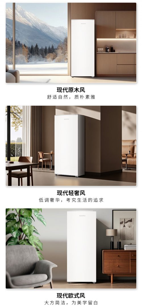 传统冷柜多为卧式设计,不仅占用空间大,还需预留开门操作距离,难以适配小户型阳台、厨房角落等紧凑空间。澳柯玛立式冷柜采用立式侧开门设计,机身小巧纤薄,可灵活放入阳台柜旁、厨房转角等区域,完美融入现代家居布局。无论是简约风、轻奢风还是北欧风装修,都能实现“储鲜工具”与“家居装饰”的和谐统一,解决了传统冷柜“占地大、颜值低”的痛点。